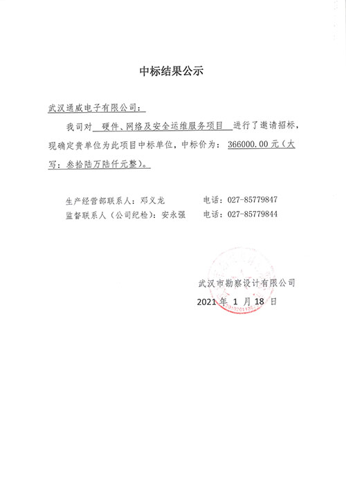 武漢市勘察設計有限公司硬件、網(wǎng)絡及安全運維服務項目中標結果公示